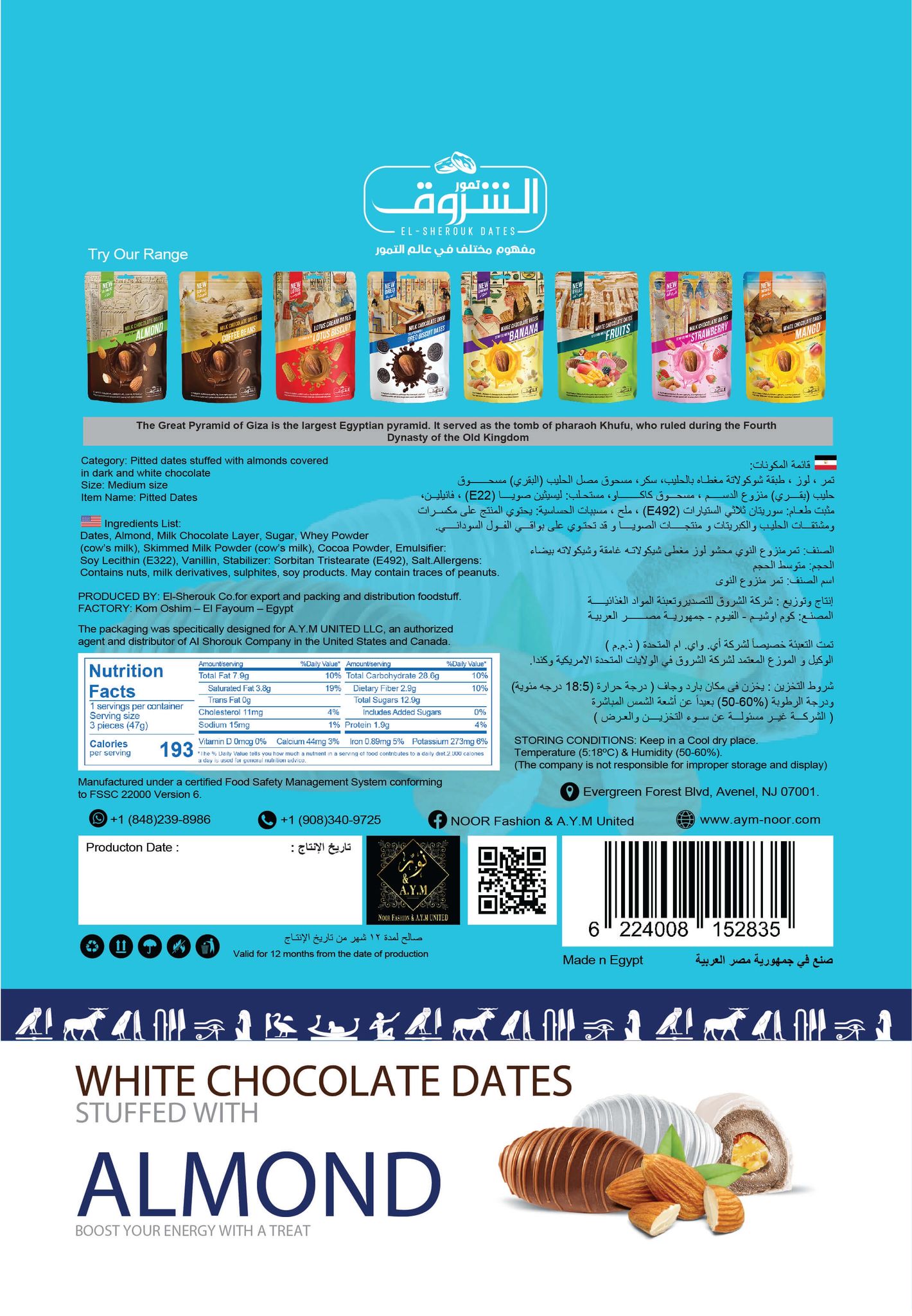 Dates, Almonds, White Chocolate (Sugar, Cocoa Butter, Milk, Skimmed Milk Powder, Whey Powder [Milk], Soy Lecithin [Emulsifier], Vanillin [Artificial Flavor]), Sorbitan Tristearate (Stabilizer), Salt.